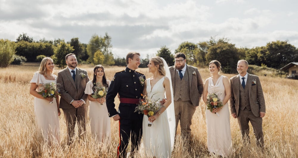 At Drovers Rest, weddings unfold across a working organic farm on the England–Wales border — with barns, woodland, courtyard fires and open fields all part of the experience.