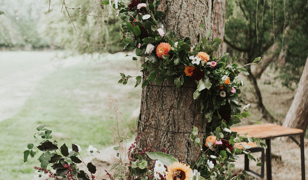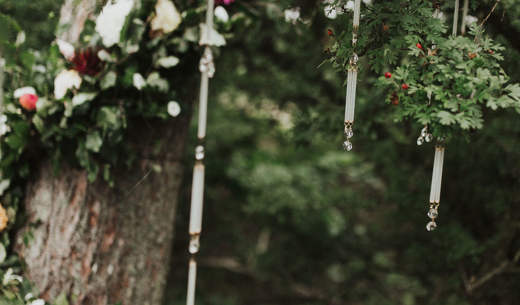 We loved the set up in the Ceremony Area. They bought old chandeliers, took them apart to hang the gems as twinkling chimes in the trees. Jamie’s Mums rugs were used to give the aisle a boho kinda vibe.The florist @ladidardyflowers had massive florals garland installations around the tree trunks with removable meadow boxes at the bases. The chairs from @rustichire added rustic charm to the ceremony. It was wonderful to see the couple marry with birdsong all around them