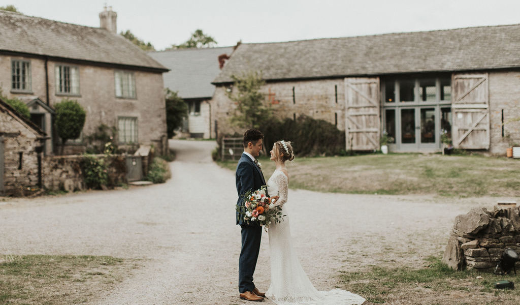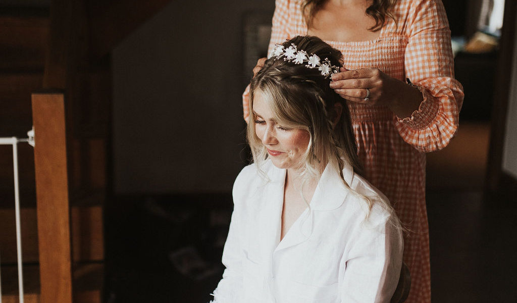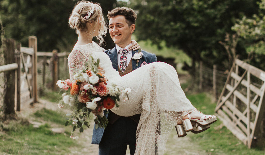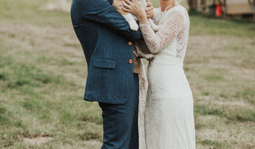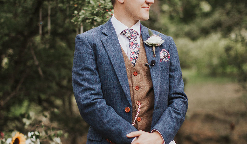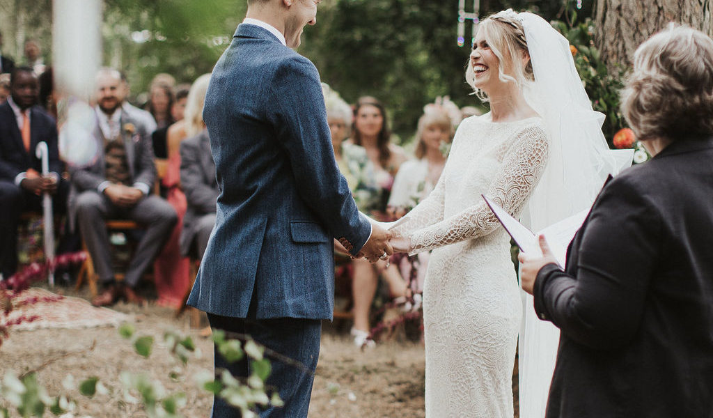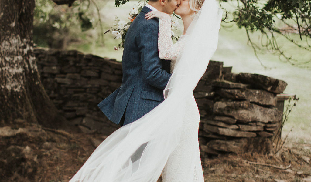 Jamie & Lou met in Hay on wye. So when they decided to marry they wanted to celebrate their nuptials back where it all began. Lou was keen on a woodland/outdoorsy wedding. When they had a look around Drovers they fell in love. They decided to choose a spot on the farm where no-one else had gotten married. A stunning space amongst the ancient Rowan, Ash, Oak and Birch trees in our re-wilded field. After an extremely hot Summer the forecast for the weekend was rain. We had the two barns they could relocate to, however it would not be the same. The day before they called it and decided no matter what, they would have it in the woodland and the fairies magically kept the rain away.